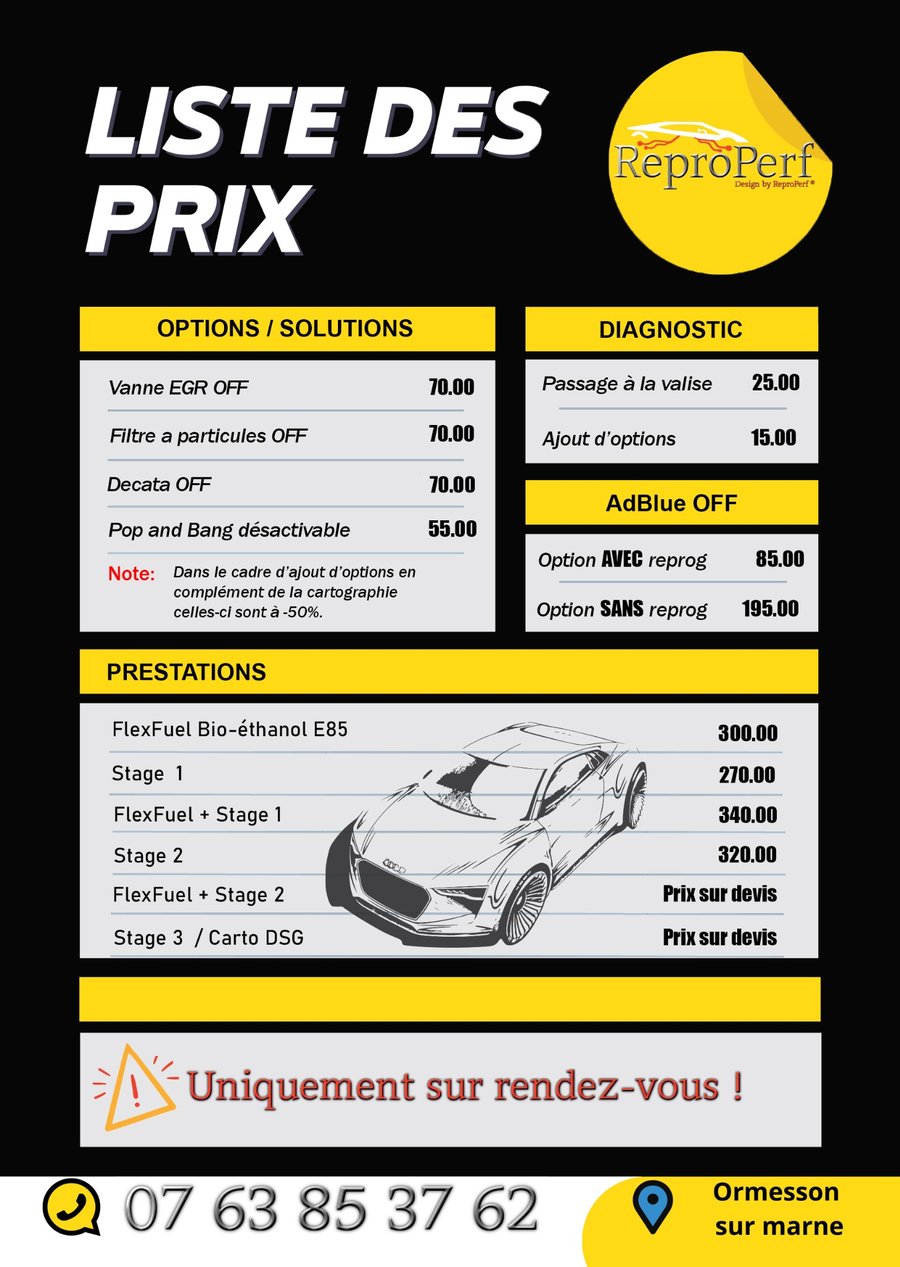 Le client reconnaît confier son véhicule à ReproPerf pour intervention et accepte que ReproPerf se décharge de toute responsabilité en cas de dommages, pannes ou détériorations pouvant survenir sur le véhicule, durant ou après l’intervention, quelle qu’en soit la cause. Le client reconnaît également que ReproPerf ne pourra être tenu responsable d’aucun dommage matériel ou corporel causé à un tiers par le véhicule, durant ou après l’intervention. En confiant son véhicule, le client confirme être le propriétaire (ou autorisé par le propriétaire) et accepte la présente décharge..